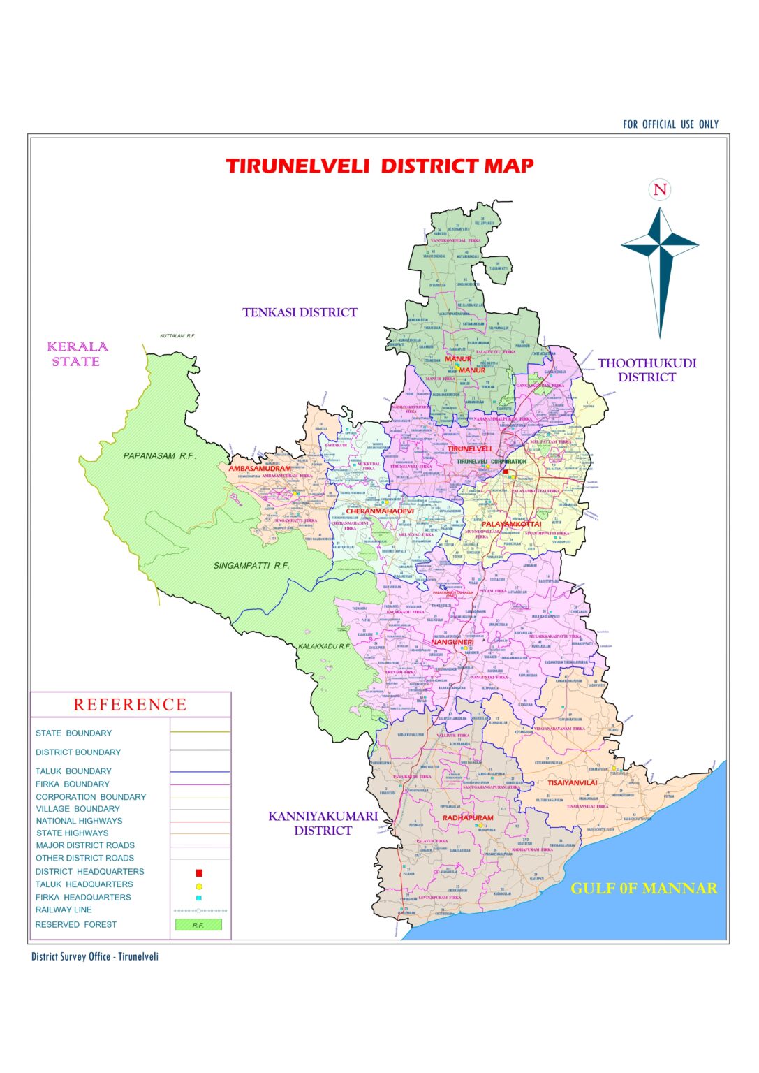 The district has a total area of 3865 sq.km, bounded on the north and east by Thoothukudi District on the west by Tenkasi District and south by Kanyakumari District. The Western Ghats in the west and Gulf of Mannar of Bay of Bengal in the south and south east act as natural boundaries in the district.