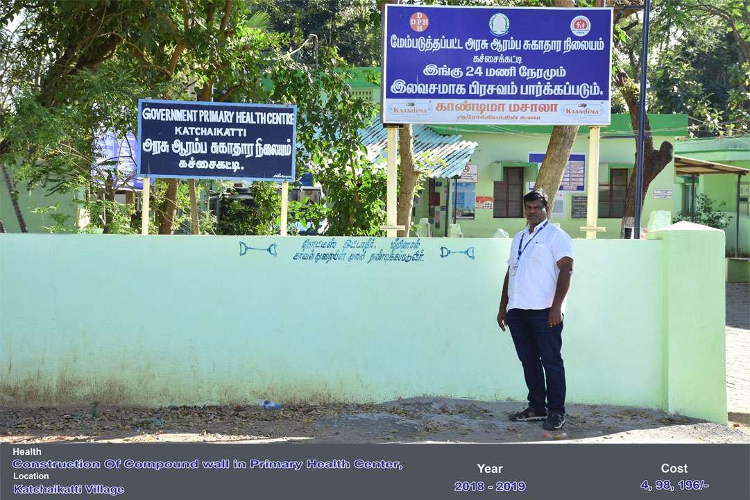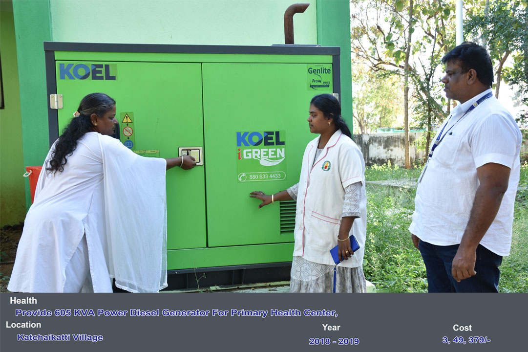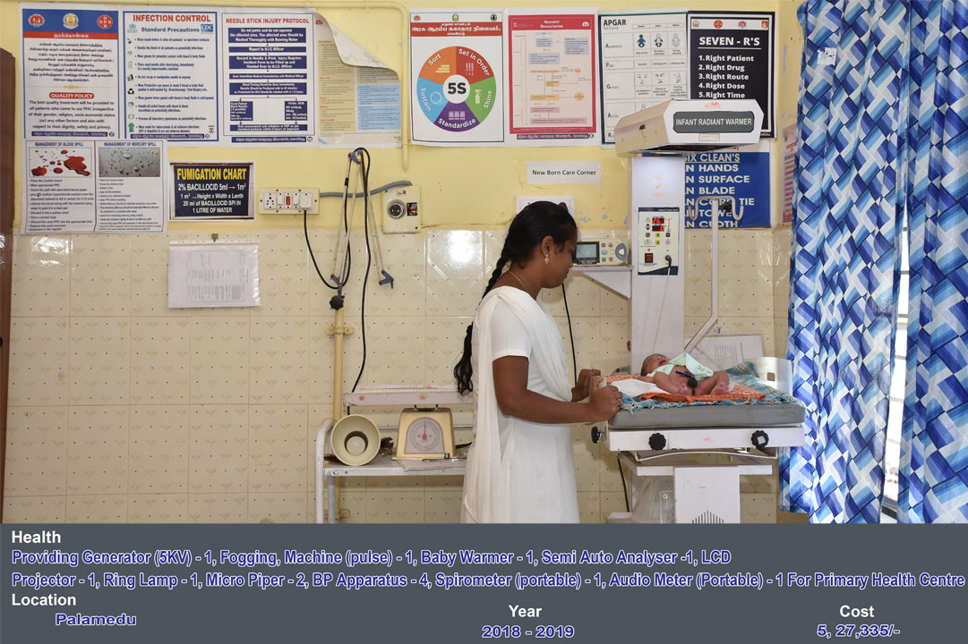 Improving Health Specialties in Palamedu PHC - Providing Generator (5KV)-1, Fogging Machine (pulse)-1, Baby Warmer -1, Semi Auto Analyser -1, LCD Projector - 1, Ring Lamp -1, Micro Piper -2, BP Apparatus -4, Spirometer (portable)-1, Audio Meter (Portable) |